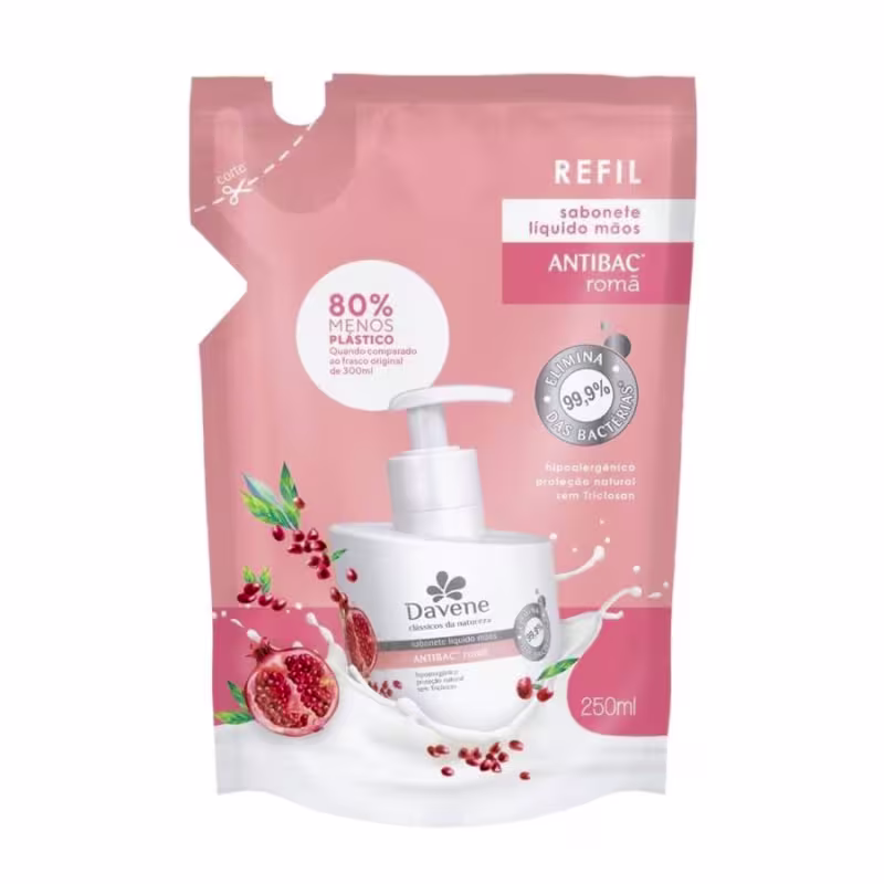 O Refil Sabonete Líquido Clássicos da Natureza Antibac Romã 250ml da Davene é perfeito para quem deseja uma limpeza eficaz, antibacteriana e hidratante. Com o poder do romã, ele proporciona proteção e cuidado à pele, deixando-a macia, revitalizada e com um aroma delicado. Ideal para o uso diário, é uma opção prática e econômica para quem busca um sabonete líquido de alta performance e um toque de frescor.