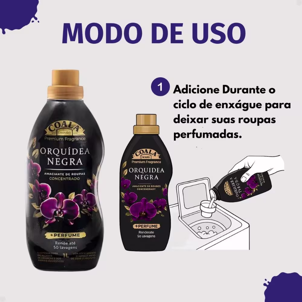 Modo de Uso/Aplicação Para obter os melhores resultados, utilize meia tampa (50ml) do Amaciante Coala Laundry Orquídea Negra Concentrado por lavagem. Aplique o produto diretamente no compartimento da máquina de lavar destinado ao amaciante ou dilua-o na água do último enxágue. Se for lavar no tanque, deixe o amaciante agir por 5 minutos para uma maciez e fragrância intensas. Dica: Para roupas mais delicadas, utilize uma quantidade menor do produto.