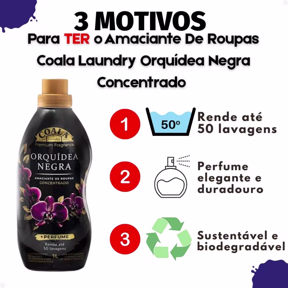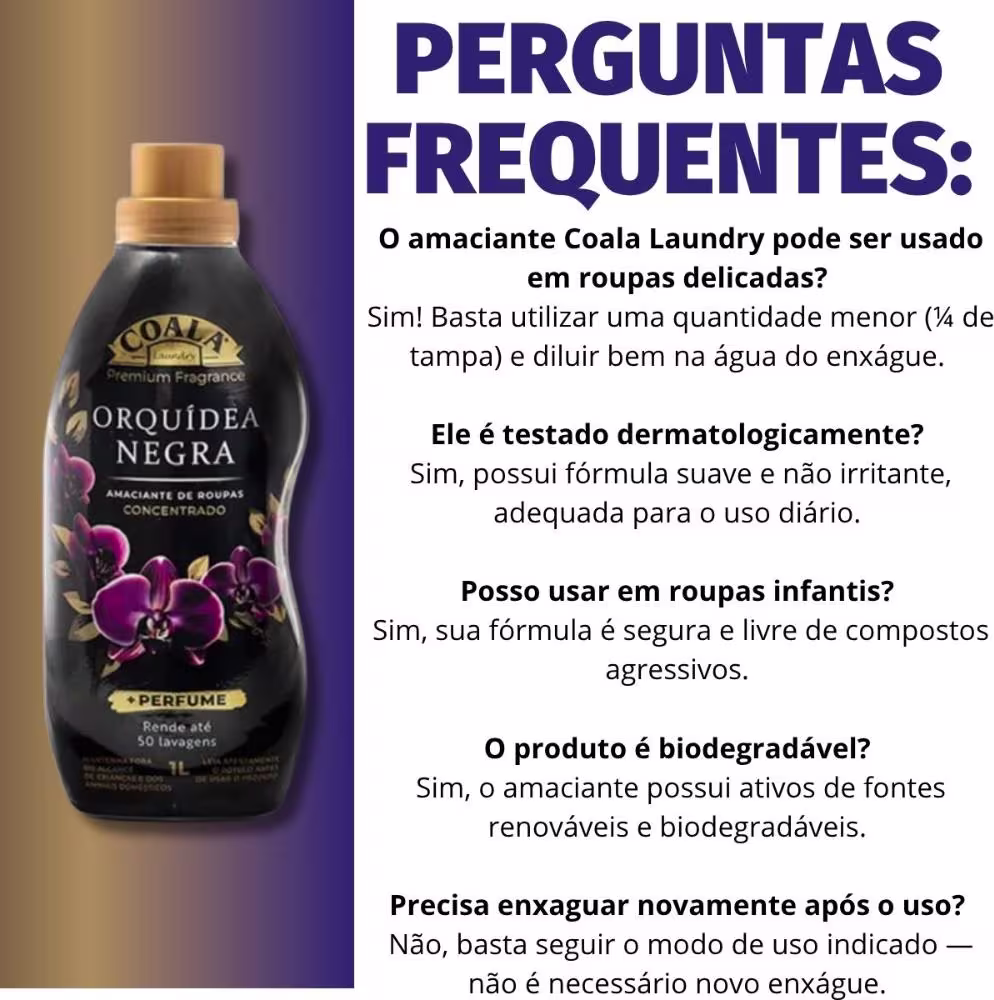 Ocasiões de Uso/Cenários Ideais O Amaciante Coala Laundry Orquídea Negra Concentrado é perfeito para o uso diário, transformando a rotina de lavagem em um momento de prazer. Ideal para quem deseja que suas roupas, toalhas e lençóis exalem um perfume sofisticado e proporcionem uma sensação de maciez e conforto duradouros. Use-o em todas as suas peças, desde roupas de trabalho até roupas de cama, para um toque de cuidado e bem-estar em cada detalhe.