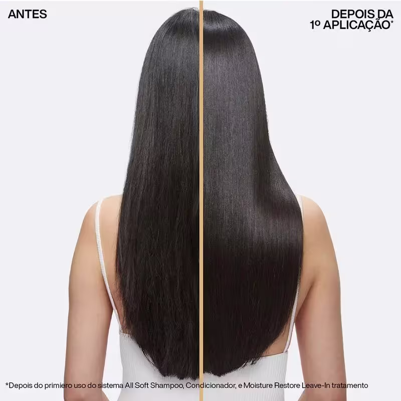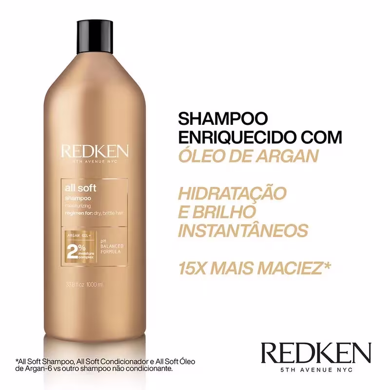 Redken All Soft - Shampoo 1L: para cabelos secos e opacos. Limpa delicadamente e é indicado para deixar os fios hidratados da raiz às pontas. Possui formulação enriquecida com Óleo de Argan + Concentrated Moisture Complex que repõe a hidratação, deixando os fios macios e cheios de vida.