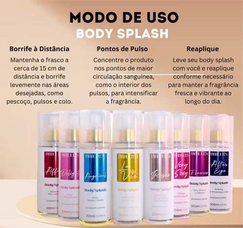 - Aplique o Body Splash generosamente sobre a pele limpa e seca, concentrando-se nos pontos de pulsação, como pescoço, pulsos e atrás das orelhas.