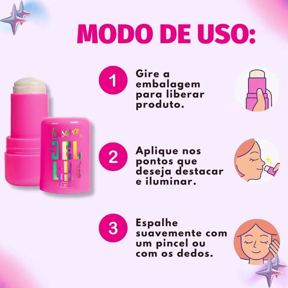 Para garantir a durabilidade do seu Iluminador Luisance Jelly Glow, mantenha-o em local seco e arejado, longe da luz solar direta. Feche bem a embalagem após o uso para evitar o ressecamento da textura jelly. Para remover, utilize um demaquilante suave ou lenço umedecido.