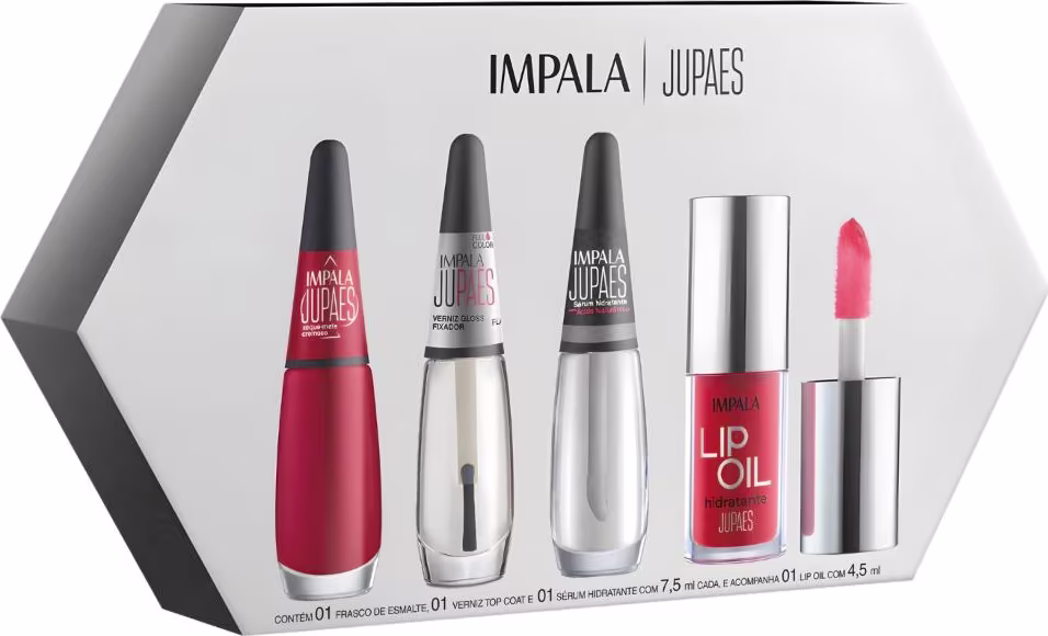 Kit Impala Ju Paes Virando O Jogo Xeque-mate: Esmalte Cremoso, Verniz Gloss, Sérum e Lip Oil