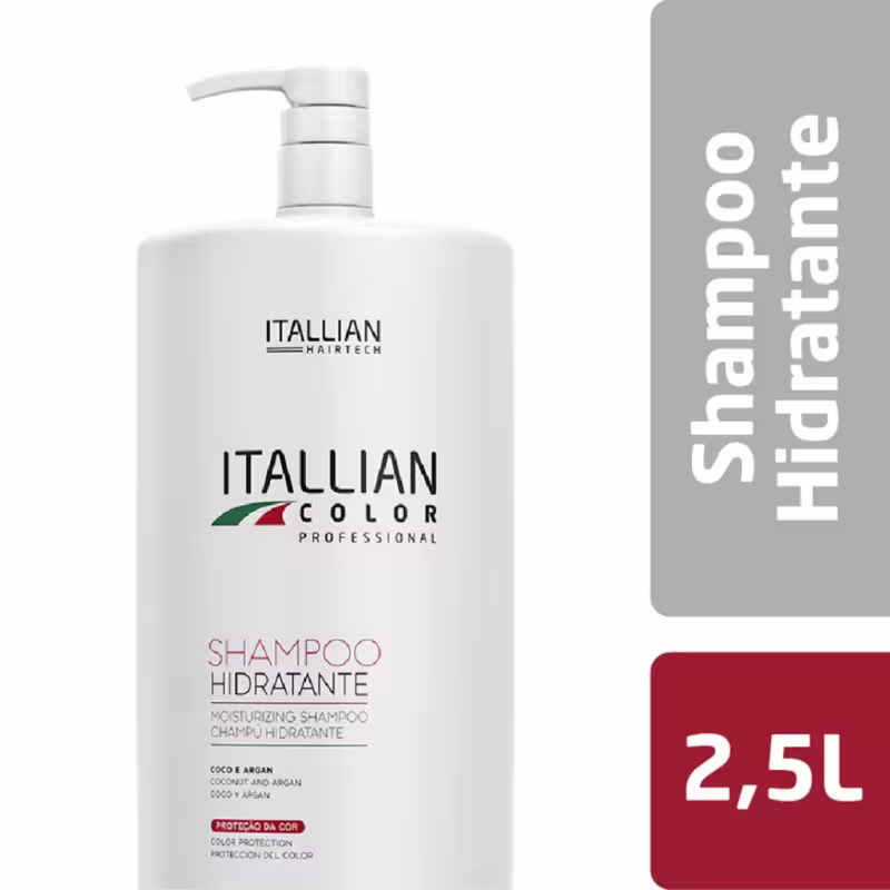 O Shampoo Hidratante Itallian Color de 2.5 litros para lavatórios, rende mais de 180 aplicações. Proteção contra ressecamento, nutrição profunda da fibra capilar, controle de frizz, hidratação, brilho, maciez, umectação e emoliência aos fios.