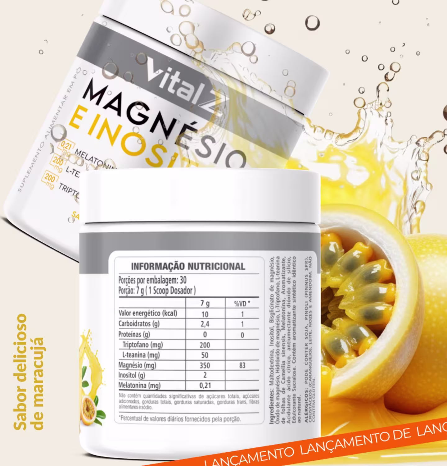 Magnésio + Inositol Vital Z com Melatonina – Sabor Maracujá | Relaxamento e Bem-Estar Noturno O Magnésio + Inositol Vital Z foi desenvolvido para quem busca relaxamento, equilíbrio do sistema nervoso e qualidade do descanso, unindo nutrientes amplamente utilizados na rotina noturna, em uma fórmula moderna, saborosa e de excelente absorção. Com sabor delicioso de maracujá, é ideal para consumo antes de dormir, fazendo parte de uma rotina de bem-estar e autocuidado. Diferenciais do Produto Fórmula completa com Magnésio, Inositol, Triptofano, L-teanina e Melatonina Alta concentração de magnésio por porção Sabor agradável de maracujá Fácil preparo: pó solúvel Rendimento de 30 porções Marca Vital Z, sinônimo de qualidade e matérias-primas premium Composição por Porção (7 g – 1 scoop) Magnésio: 350 mg Inositol: 2 g Triptofano: 200 mg L-teanina: 50 mg Melatonina: 0,21 mg Valor energético: 10 kcal Informações Importantes Não contém quantidades significativas de gorduras, proteínas ou açúcares adicionados Produto em pó, com excelente dissolução Uso recomendado para adultos Conteúdo da Embalagem 1 pote de Magnésio + Inositol Vital Z Peso líquido conforme rótulo Scoop dosador incluso Indicação de Uso Diluir 1 scoop (7 g) em água, preferencialmente à noite, ou conforme orientação de profissional de saúde. Aviso Legal Este produto não é medicamento. Não substitui uma alimentação equilibrada e hábitos de vida saudáveis. Manter fora do alcance de crianças.