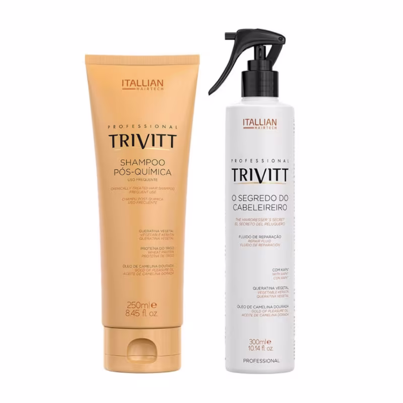 Itallian Trivitt Shampoo Pós Química para uso frequente foi desenvolvido para cabelos quimicamente tratados. Repara os danos, repõe a hidratação e proporciona brilho e fios macios. Limpa sem ressecar e deixa o cabelo mais fácil de pentear após escovas progressivas, alisamentos, relaxamentos, coloração e descoloração por recuperar as agressões da química com hidratação, emoliência e reparação para um sensorial macio e fios com brilho.