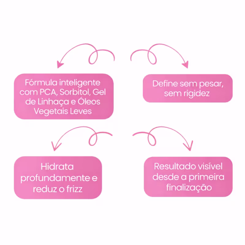 Sua fórmula inteligente, enriquecida com PCA, Sorbitol, Gel de Linhaça e óleos vegetais leves, atua na reposição da umidade, melhora a elasticidade da fibra capilar e reduz o ressecamento, fatores diretamente relacionados ao encolhimento. Dessa forma, o produto ajuda a manter os cachos definidos por mais tempo, com controle do frizz e toque macio, sem rigidez ou peso.