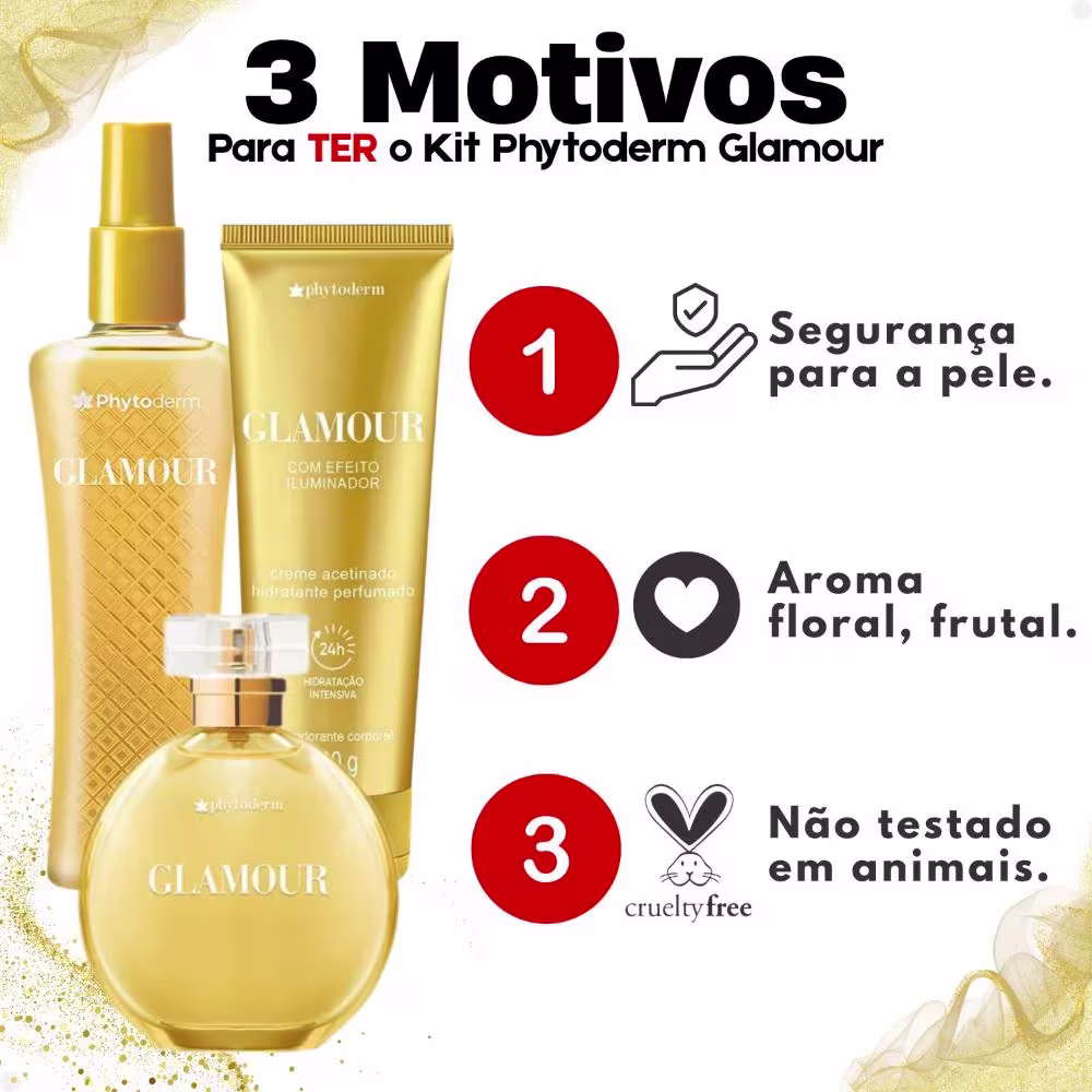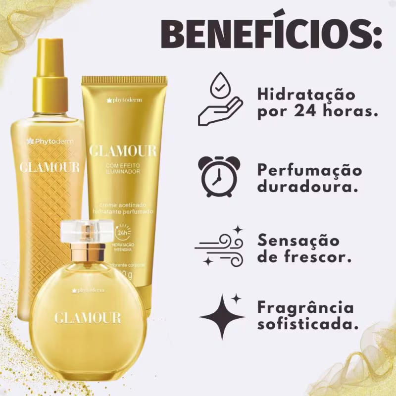 As vibrantes notas de rosa e jasmim se unem de maneira perfeita com o frescor frutal da mandarina e da pera, complementadas ao fundo de nobres madeiras, criando uma harmonia que encanta. O creme hidratante, além de intensificar a perfumação, oferece 24 horas de hidratação intensa, deixando a pele com um toque aveludado e acetinado. Ideal para todos os tipos de pele, o Kit Phytoderm Glamour é o seu segredo para um dia a dia mais perfumado e uma pele impecavelmente cuidada.