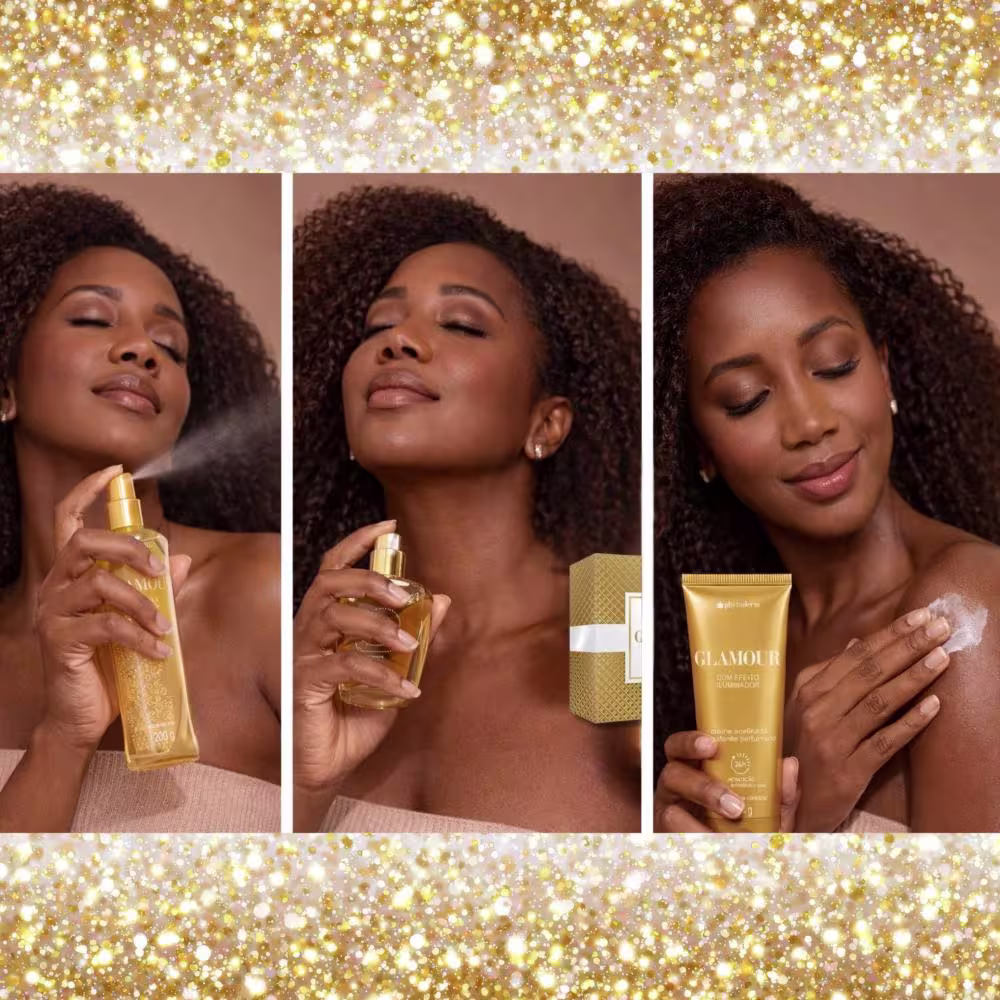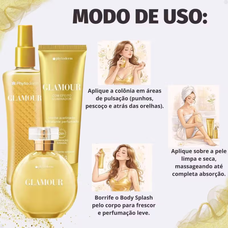 Para uma experiência completa, comece aplicando o Hidratante Phytoderm Glamour sobre a pele limpa e seca, massageando suavemente até completa absorção para garantir hidratação intensa. Em seguida, borrife o Body Splash Phytoderm Glamour por todo o corpo para uma sensação de frescor e uma camada leve de perfumação. Finalize com a Colônia Phytoderm Glamour nos pontos de pulsação (punhos, pescoço e atrás das orelhas) para uma fragrância mais concentrada e duradoura, complementando o aroma e prolongando a sensação de bem-estar.