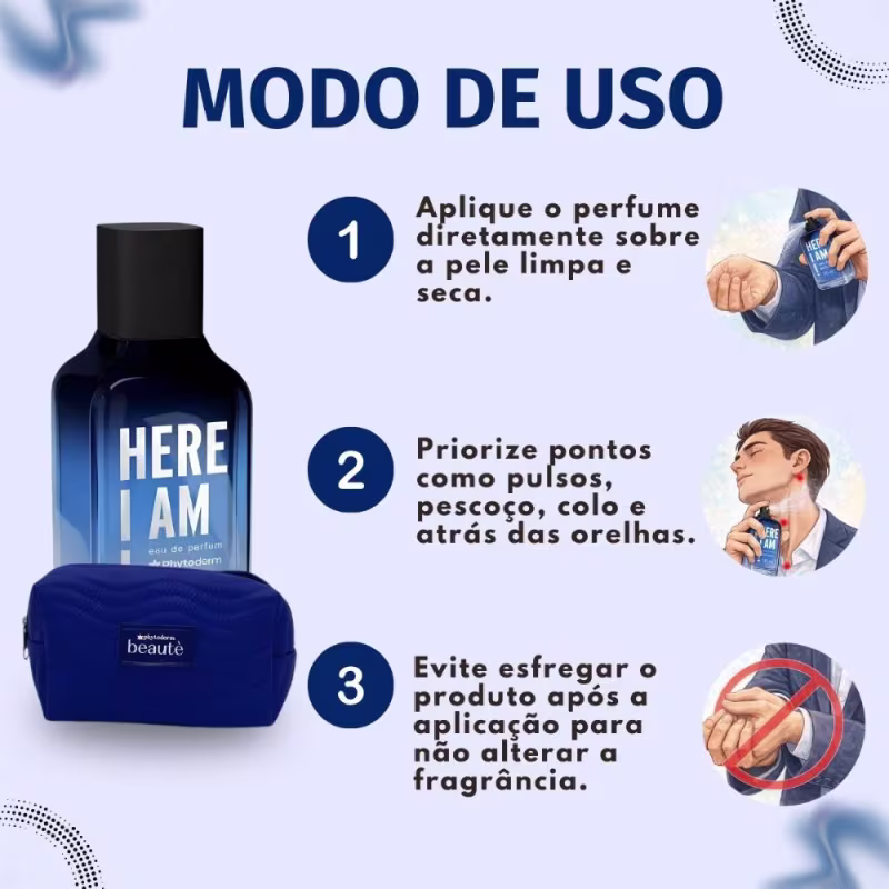 Para obter o melhor desempenho do seu Perfume Phytoderm Here I Am Eau de Parfum, aplique-o sobre a pele limpa e seca, preferencialmente nas áreas de maior circulação sanguínea, como pulsos, pescoço e atrás das orelhas. Mantenha uma distância de aproximadamente 15-20 cm da pele ao borrifar. Evite esfregar o perfume após a aplicação para não alterar a evolução da fragrância.