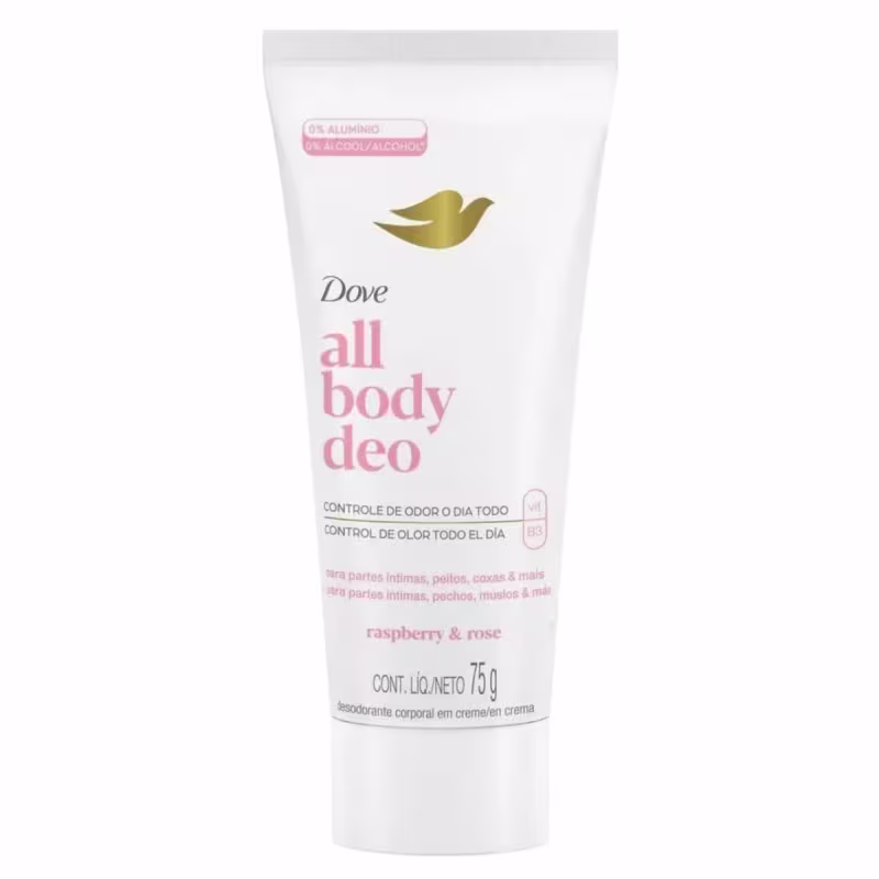 O Desodorante All Body Deo Creme Dove Raspberry e Rose controla o odor do seu corpo todo com ingredientes skincare que cuidam da sua pele. Esse desodorante corporal contém em sua fórmula vitamina E e 3% de vitamina B3 para uma pele cuidada e mais saudável. Sua tecnologia de controle de odores previne os maus odores do corpo, protegendo você o dia todo. O desodorante All Body Deo Dove é sem álcool*, sem alumínio e possui um pH balanceado. Além disso, é ginecologicamente** e dermatologicamente testado, ideal para partes íntimas, peitos, coxas, barriga, costas e pés. Sua aplicação é invisível e não deixa resíduos. Além de proteger contra o mau odor do corpo todo, possui uma delicada fragrância misturada de rosas, muguet e jasmim, com toque cítrico e fundo de baunilha, almíscar e madeira, oferecendo uma sensação de limpeza e frescor revitalizante. Dove proporciona proteção eficaz e cuidado para a pele para que você possa se libertar de qualquer desconforto e se sentir confiante o dia todo. Aplique uma pequena quantidade do creme desodorante All Body Deo Dove Raspberry e Rose externamente onde deseja combater o odor. Não aplique sobre a pele úmida e aplique somente nos órgãos genitais externos. Dove é certificada Cruelty-Free pela PETA, sendo assim, não realizamos e nem realizaremos testes em animais em nenhum lugar do mundo. Além disso, nosso desodorante corporal é vegano. Sua embalagem é reciclável, por favor recicle. *Não contém álcool etílico. **Somente creme.