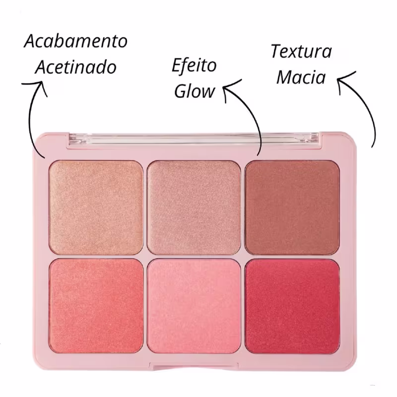Paleta completa com 6 cores, sendo 2 blushes e 4 iluminadores.
