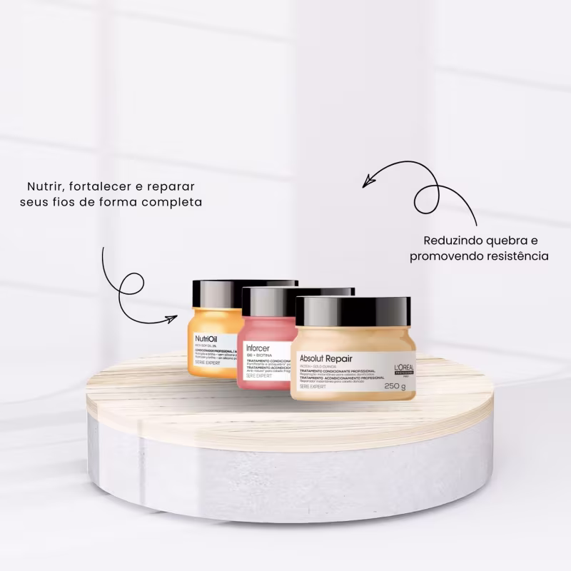 Não sei o CEPEste cronograma capilar foi cuidadosamente montado para nutrir, fortalecer e reparar seus fios de forma completa. A máscara NutriOil restaura lipídios perdidos, repõe óleo e brilho; a Inforcer age na reconstrução interna, reduzindo quebra e promovendo resistência; e a Absolut Repair reconstrói as áreas danificadas, reconstruindo a fibra capilar. Juntas, essas máscaras compõem uma rotina profissional que entrega nutrição, força e reparação profunda aos cabelos.