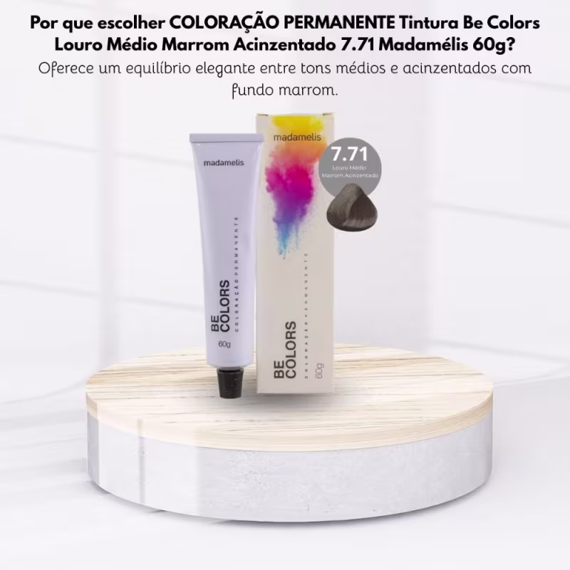Não sei o CEPA Coloração Madamelis Be Colors Louro Médio Marrom Acizentado 7.71 60 g combina a sofisticação do marrom com reflexos acinzentados, resultando em um tom moderno e levemente frio. É ideal para quem deseja um louro médio mais neutro, elegante e com acabamento profissional.