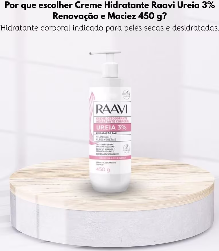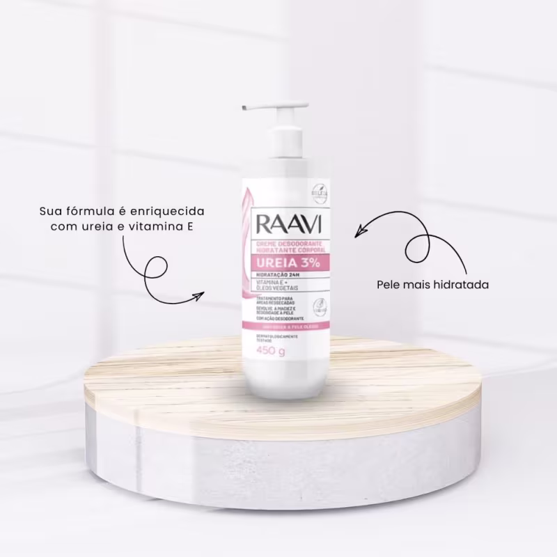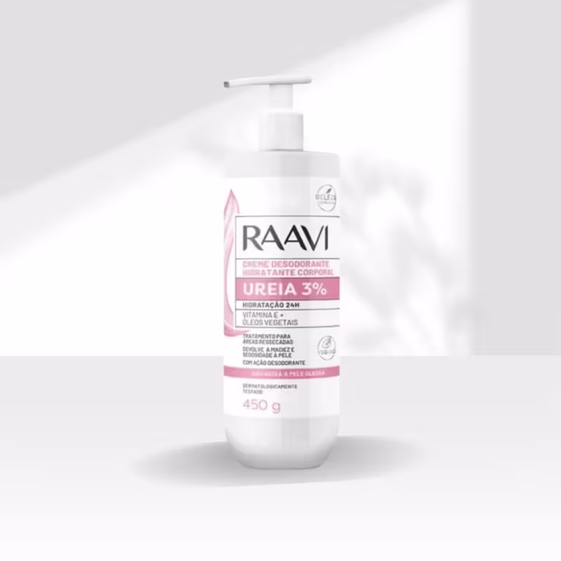 O Creme Hidratante Raavi Ureia 3% 450g promove hidratação intensa e renovação gradual da pele, garantindo maciez, suavidade e toque sedoso desde a primeira aplicação. Desenvolvido para repor o nível de água da pele e fortalecer a barreira cutânea, ele melhora a textura, evita o ressecamento e proporciona sensação confortável e duradoura.