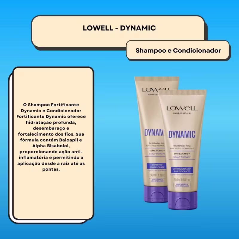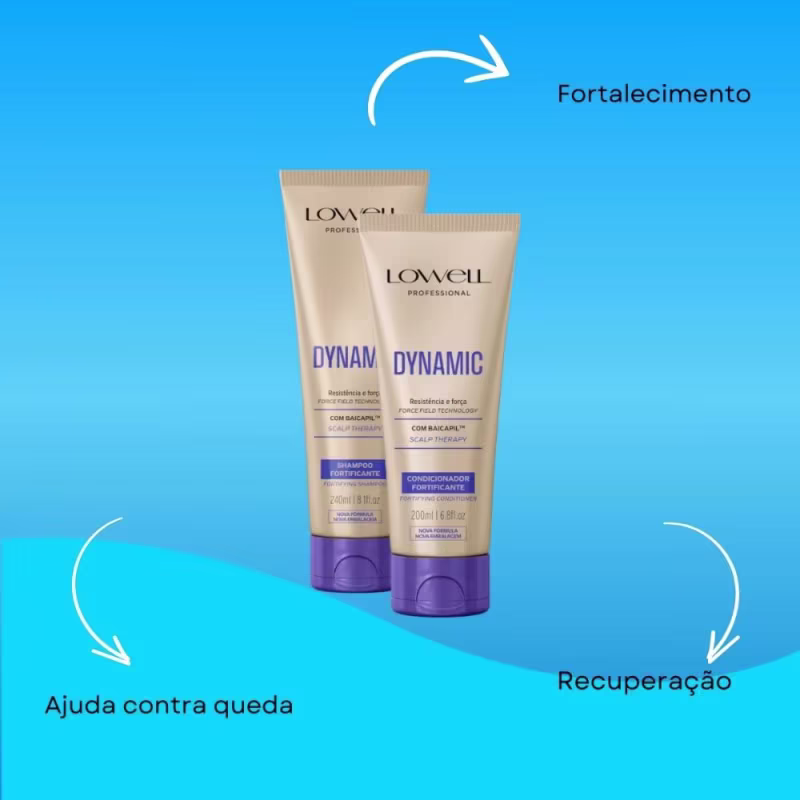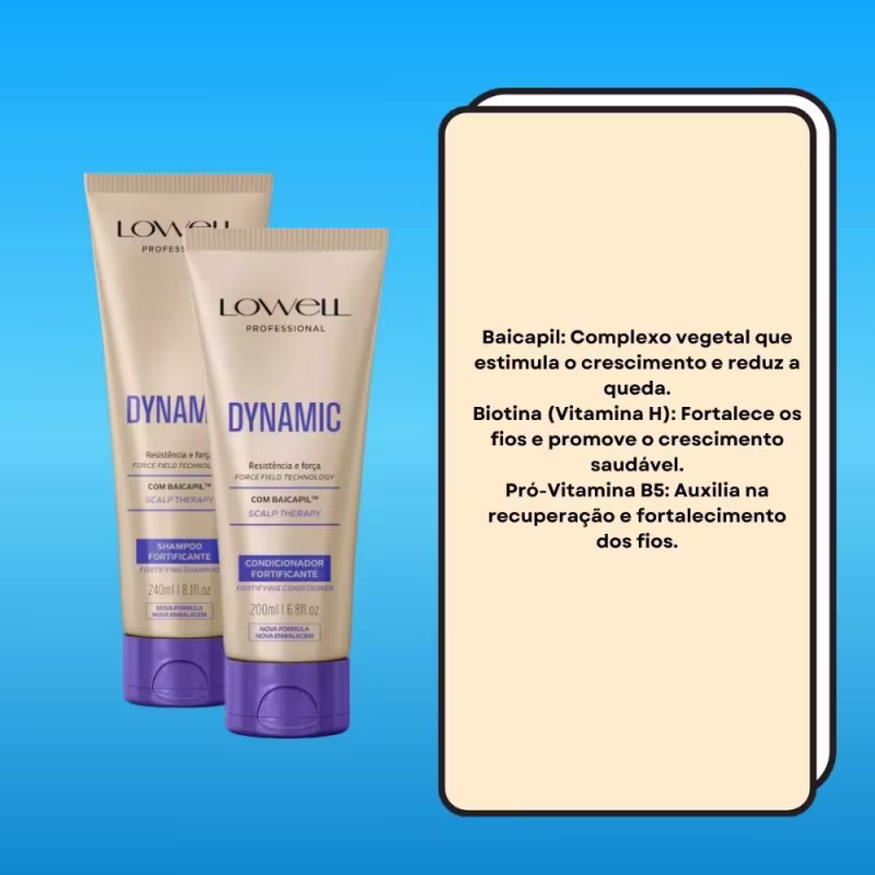 O Shampoo Fortificante Dynamic e Condicionador Fortificante Dynamic oferece hidratação profunda, desembaraço e fortalecimento dos fios. Sua fórmula contém Baicapil e Alpha Bisabolol, proporcionando ação anti-inflamatória e permitindo a aplicação desde a raiz até as pontas.