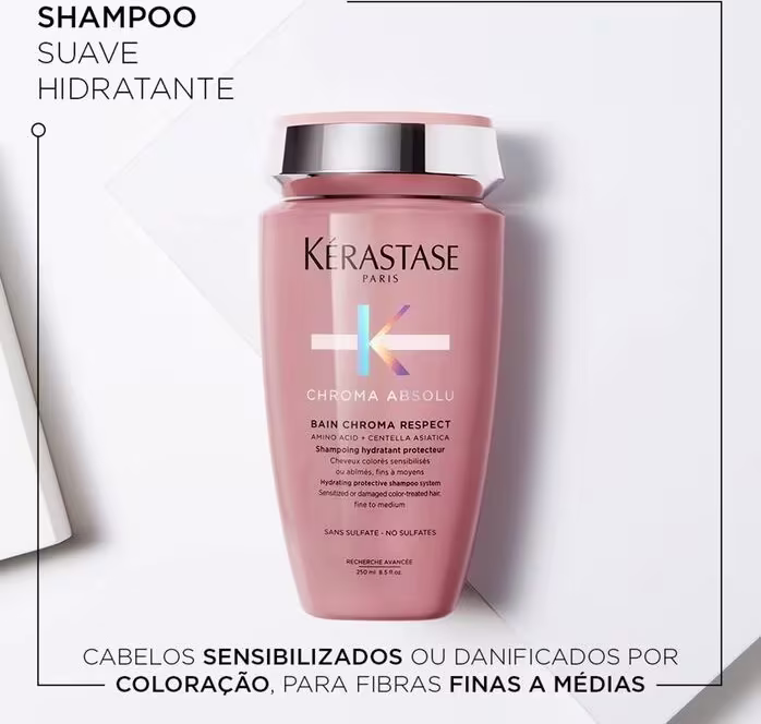 Bain Chroma Respect é um shampoo suave hidratante para cabelos coloridos sensíveis ou danificados, adaptado para fibras finas a médias. A textura em gel creme opaca hidrata profundamente e cuida da fibra, respeitando e preservando o cabelo do desbotamento da cor. Enriquecido com uma potente combinação de Aminoácidos e Centelha Asiática, o shampoo penetra no núcleo da fibra para um cabelo mais forte e resistente. O cabelo fica com 74% mais brilho, mais hidratação e reduz a porosidade para reter a cor. A fibra fica tão saudável que 92% da intensidade da cor é preservada mesmo após 6 semanas. Livre de sulfatos, silicones e parabenos.