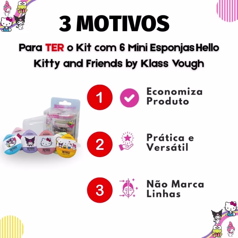Não sei o CEPDescubra o Kit com 6 Mini Esponjas Hello Kitty and Friends by Klass Vough, sua ferramenta essencial para alcançar uma maquiagem impecável e com detalhes perfeitos. Criado pela renomada KLASS VOUGH, este kit exclusivo une a funcionalidade profissional ao adorável universo dos personagens Sanrio, transformando sua rotina de beleza em um ritual de elegância e precisão. Ideal para quem busca um acabamento profissional e minucioso em áreas delicadas do rosto, este kit é um item indispensável para os fãs da Hello Kitty e apaixonados por maquiagem, proporcionando resultados incríveis com um toque de diversão.