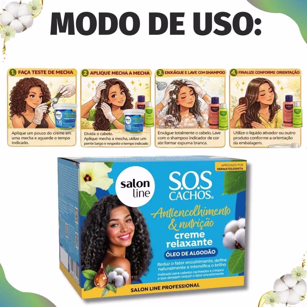 Com os cabelos limpos e úmidos, aplique o Creme Relaxante Salon Line Sos Cachos Óleo de Algodão mecha a mecha, do comprimento às pontas. Desembarace os fios com os dedos ou um pente de dentes largos e, em seguida, amasse-os de baixo para cima para ativar e definir os cachos. Não enxágue. Deixe secar naturalmente ou utilize um difusor para um resultado mais rápido e definido.
