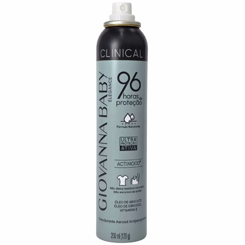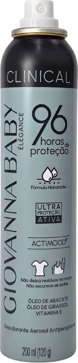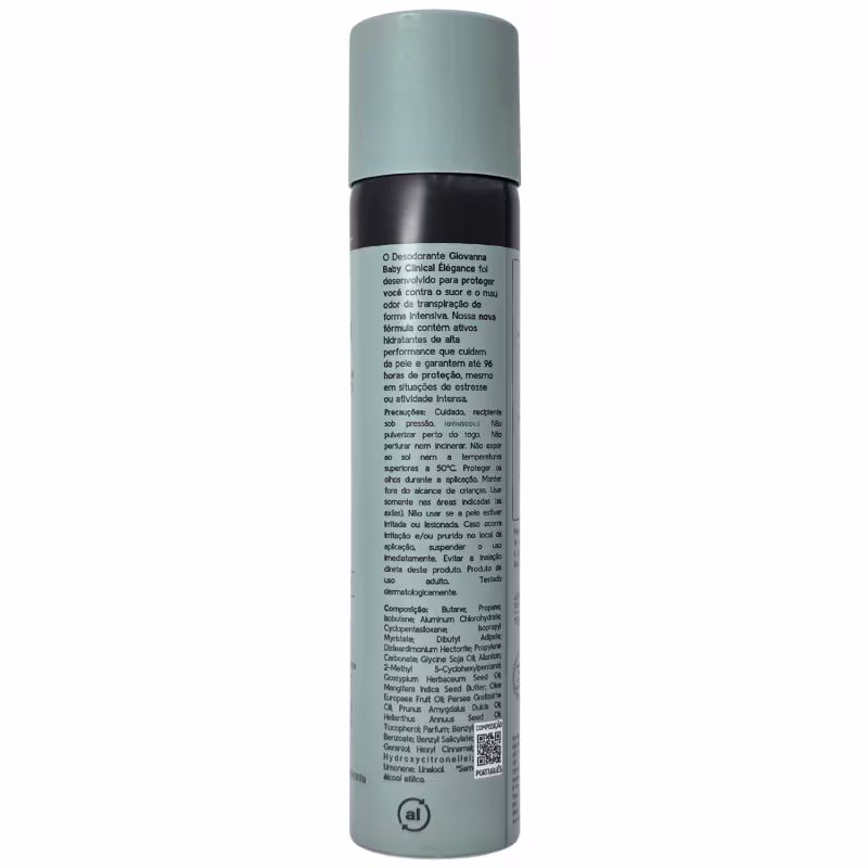 Finalidade: O Desodorante Giovanna Baby Clinical Élégance foi desenvolvido para proteger você contra o suor e o mau odor da transpiração de forma intensiva. Nossa nova fórmula contém ativos hidratantes de alta performance que cuidam da pele e garantem até 96 horas de proteção, mesmo em situações de estresse ou atividade intensa.