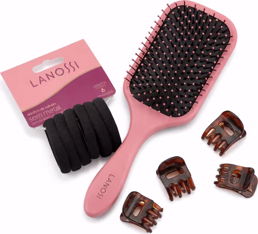 Kit Lanossi Beauty & Care – 1 Escova Raquete (Cor sortida Preta ou Rosa) + 4 Prendedores + 6 Elást