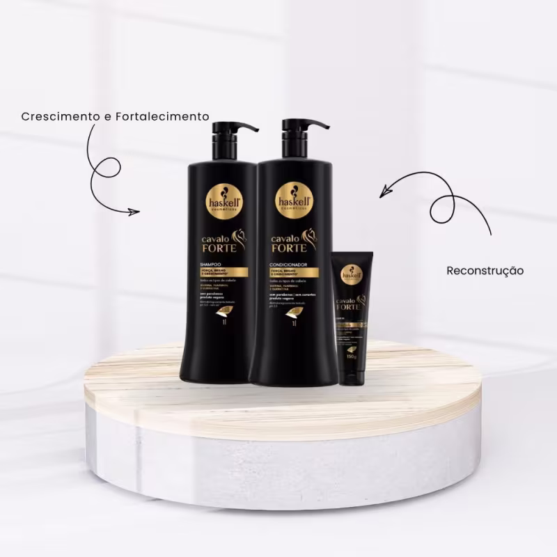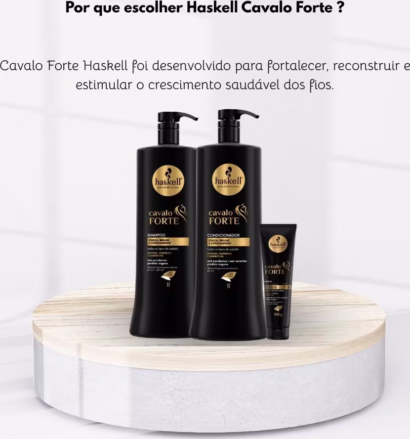 Sugestão de uso complementar: Combine com a Máscara Cavalo Forte Haskell e o Tônico Cavalo Forte Haskell para potencializar os resultados. O uso conjunto fortalece a raiz e garante nutrição completa.