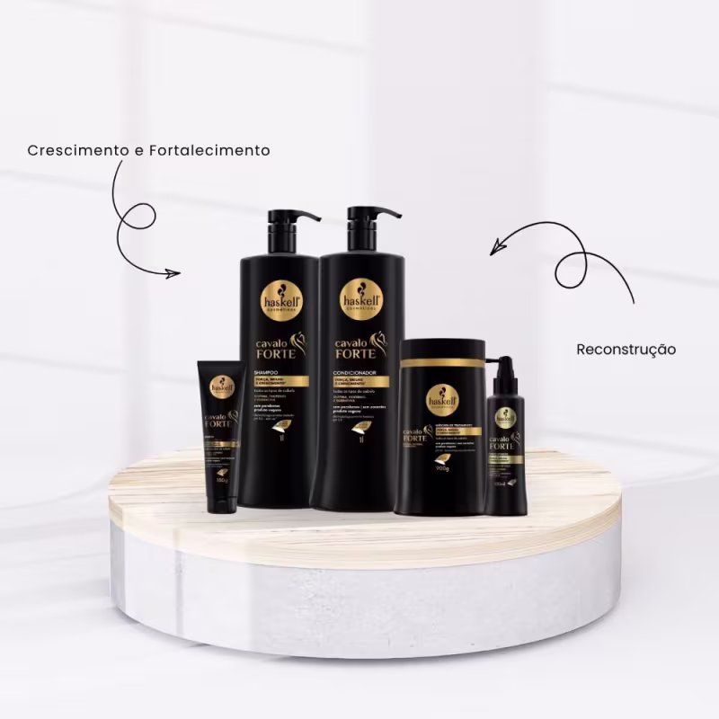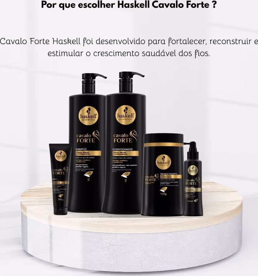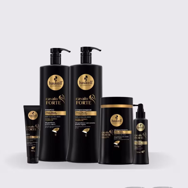 Não sei o CEPO Kit Haskell Cavalo Forte Shampoo, Condicionador, Máscara 900g, Leave-In e Tônico Capilar é um tratamento completo que fortalece, nutre e estimula o crescimento saudável dos fios. Ideal para cabelos fragilizados, quebradiços ou com dificuldade de crescimento, ele atua desde o couro cabeludo até as pontas, promovendo reconstrução da fibra capilar, brilho intenso e resistência. A linha Cavalo Forte da Haskell combina ativos potentes que revitalizam e encorpam o cabelo sem deixá-lo pesado.
