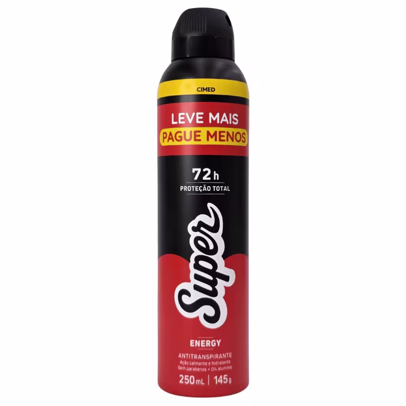 Finalidade: O Desodorante Antitranspirante Energy Super é um antitranspirante aerossol que oferece 72 horas de proteção contra suor e mau odor, com fragrância energizante, ação hidratante e calmante, sendo livre de álcool, parabenos e alumínio, ideal para peles sensíveis e uso diário, com toque seco e rápida absorção.