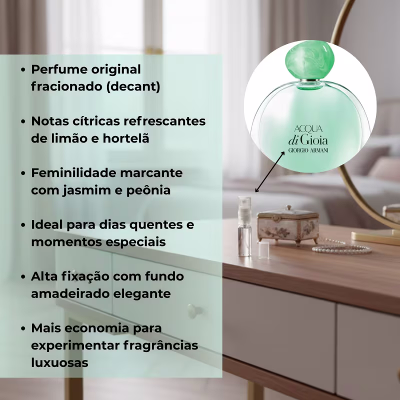 A Fragrância 5ml Acqua di Gioia Eau de Parfum, da Giorgio Armani, traduz frescor, liberdade e feminilidade em uma composição sofisticada e envolvente. Ideal para quem deseja experimentar o perfume original, levar na bolsa ou reaplicar ao longo do dia.