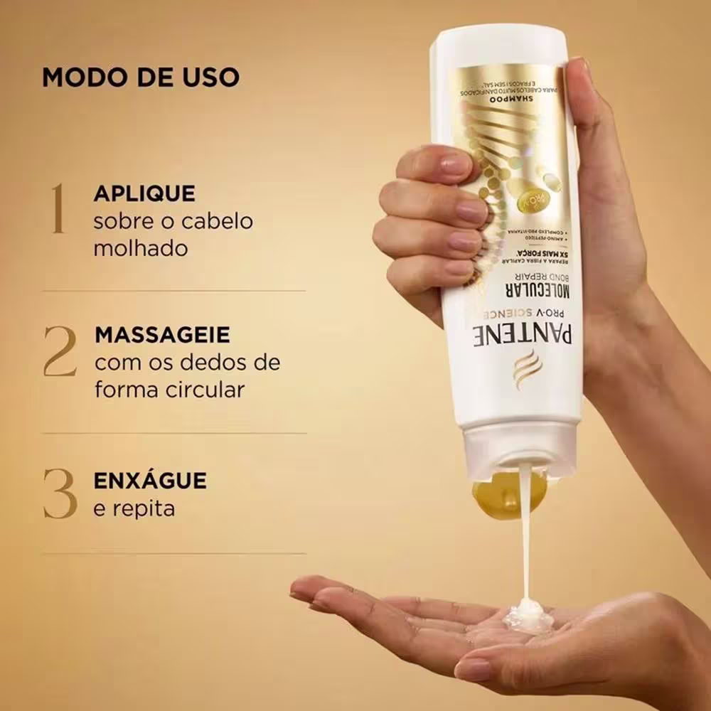 Molecular Bond Repair de Pantene limpa profundamente e prepara seu cabelo para uma profunda absorção de agentes reparadores que ajudam a fortalecer e proteger sua estrutura molecular. Fórmula exclusiva com Amino-Peptídeo e Complexo Pro-Vitamina.
