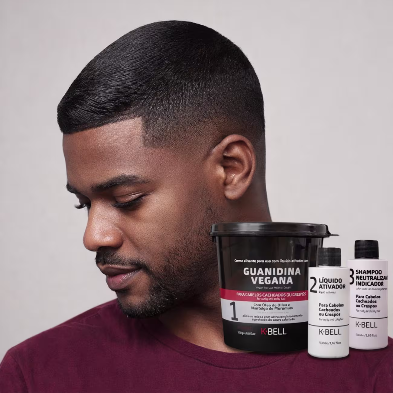 O Kit K·BELL Guanidina Vegana é composto por Creme Alisante, Líquido Ativador e Shampoo Neutralizante Indicador, desenvolvidos para atuar em conjunto no processo químico com mais segurança e cuidado. Sua fórmula é enriquecida com Óleo de Oliva e Manteiga de Murumuru, que auxiliam no condicionamento intenso, na proteção do couro cabeludo e na redução do ressecamento durante o procedimento.