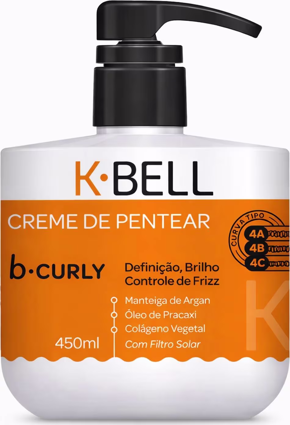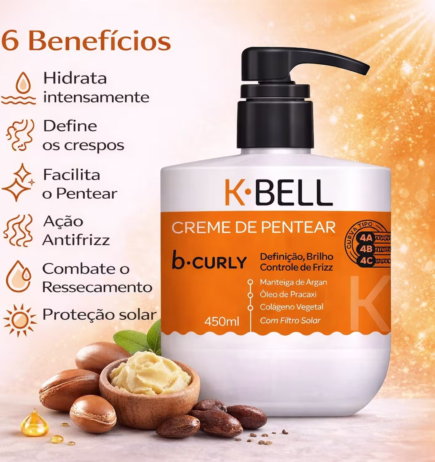 O Creme de Pentear K·BELL b·CURLY traz uma fórmula altamente nutritiva, enriquecida com a poderosa combinação de Manteiga de Argan, Óleo de Pracaxi e Colágeno Vegetal, ativos reconhecidos por sua ação restauradora, nutritiva e fortalecedora da fibra capilar. Sua tecnologia atua profundamente nos fios, devolvendo maciez, elasticidade e brilho, além de oferecer proteção solar, que ajuda a preservar a saúde e a definição dos cabelos ao longo do dia.