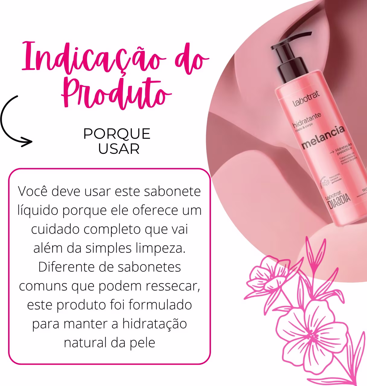 Modo de Uso: Use o sabonete líquido durante o banho. Após secar a pele, aplique o hidratante em todo o corpo com movimentos suaves.
