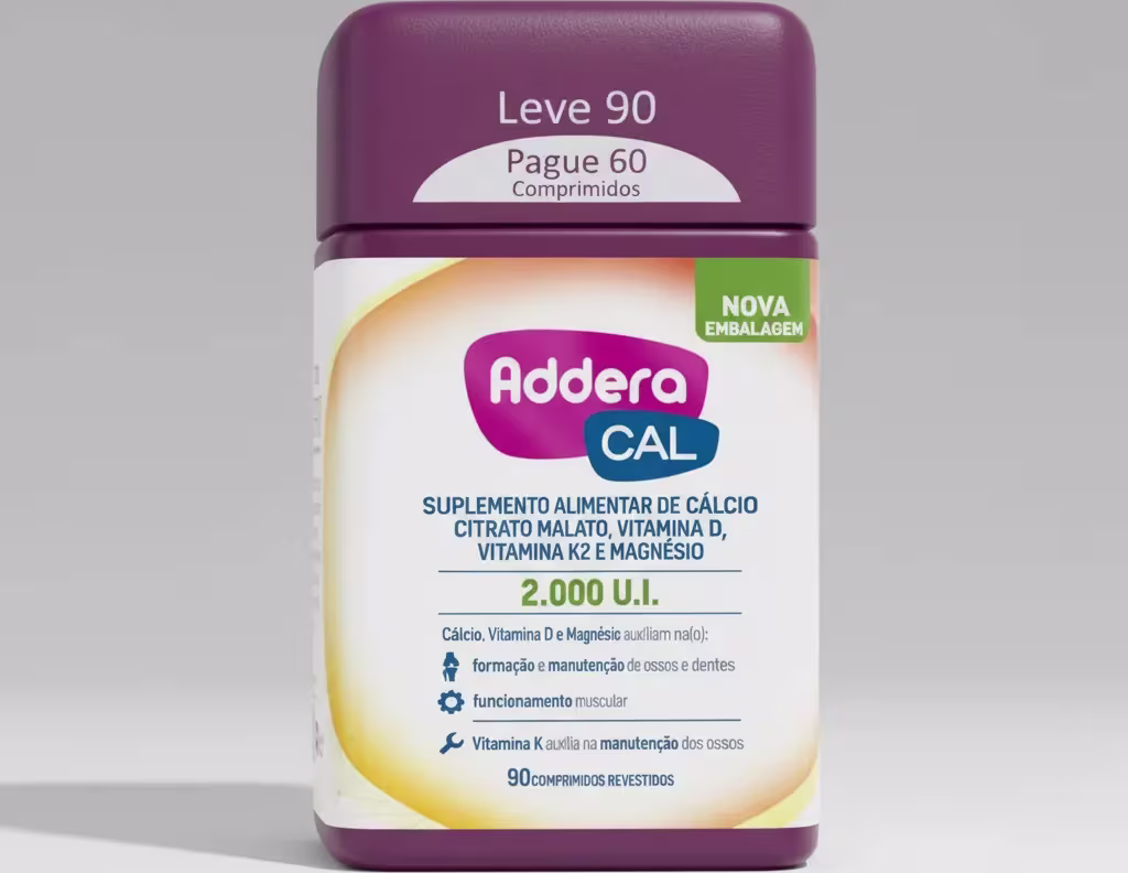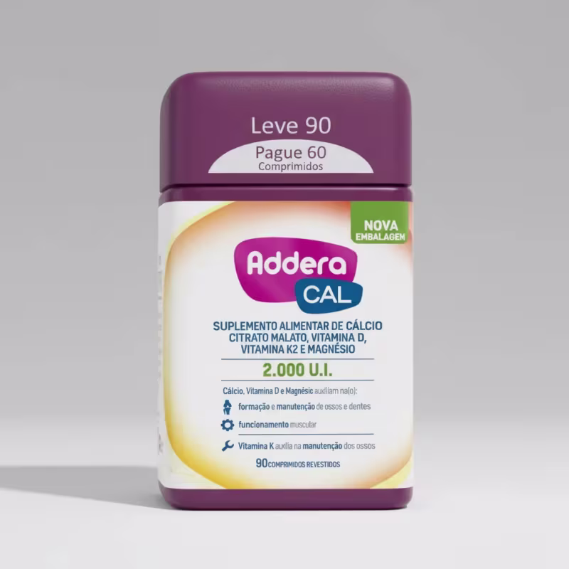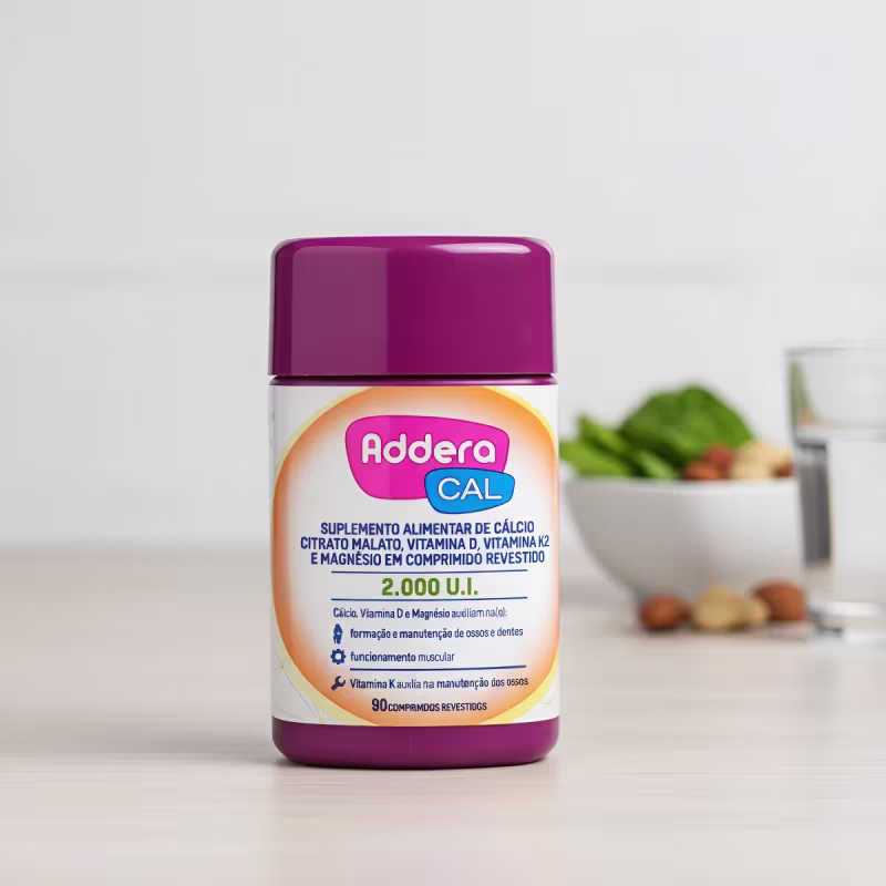 Addera Cal 2.000ui é um suplemento nutricional desenvolvido pela Mantecorp Farmasa, ideal para quem busca fortalecer a saúde óssea e imunológica. Com uma fórmula rica em Vitamina D, Cálcio, Citrato Malato, Vitamina K2 e Magnésio, cada comprimido oferece 2.000ui de Vitamina D, contribuindo para a absorção de cálcio e a manutenção de ossos saudáveis. Este produto é especialmente recomendado para adultos a partir de 19 anos, sendo uma excelente opção para aqueles que desejam complementar sua dieta de forma prática e eficaz. Os comprimidos revestidos garantem uma fácil ingestão, tornando a rotina de suplementação mais simples e agradável. Addera Cal 2.000ui não é livre de glúten, contém lactose, o que deve ser considerado por pessoas com restrições alimentares. Com 90 comprimidos por embalagem, você terá um suprimento duradouro para apoiar sua saúde e bem-estar.