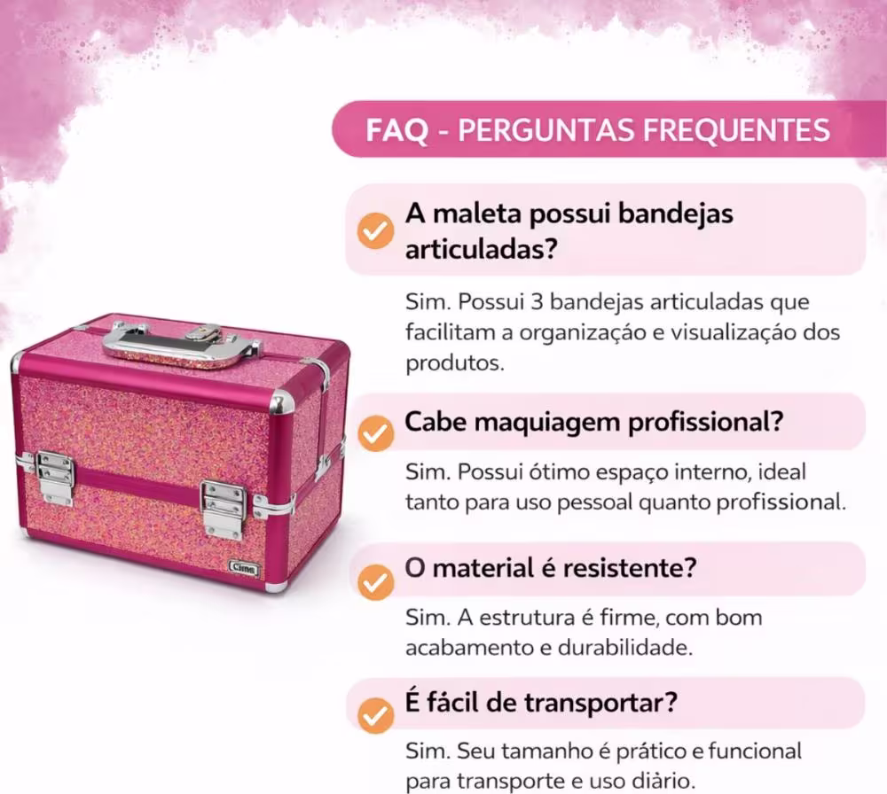 Sim. Possui 3 bandejas articuladas que facilitam a organização e visualização dos produtos. - 2. Cabe maquiagem profissional?