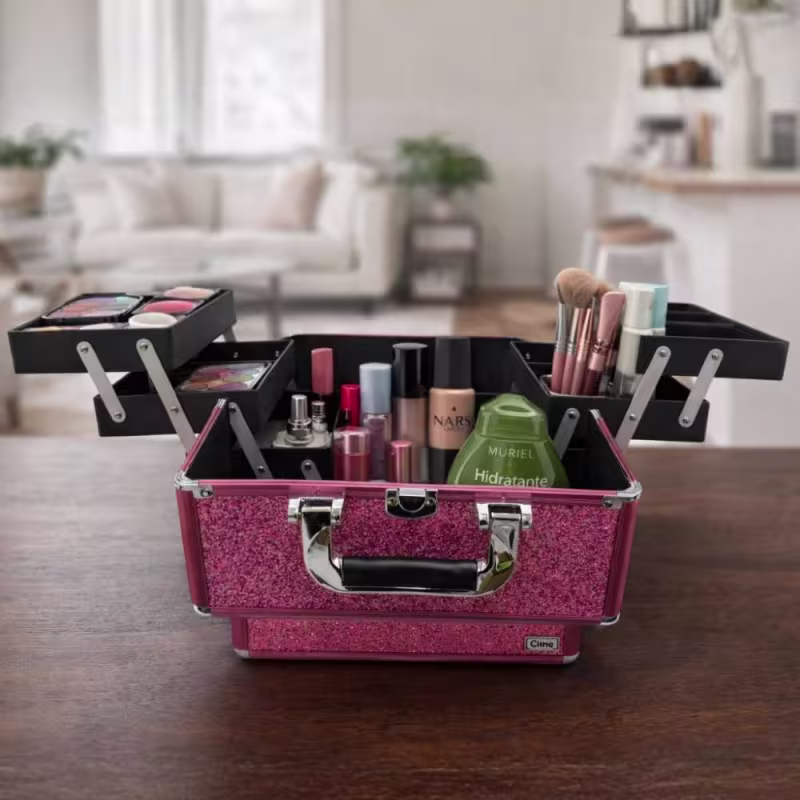 Pink Glitter e detalhes em rosa, ela traz um visual premium e estrutura resistente para guardar maquiagens, pincéis e acessórios com segurança. Possui