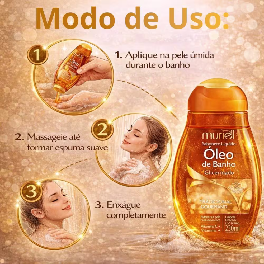 Aplique o Sabonete Líquido Muriel Óleo De Banho Tradicional Gourmand sobre a pele úmida durante o banho, massageando suavemente. Enxágue completamente com água. Para uma experiência mais completa, utilize uma esponja macia durante a aplicação.