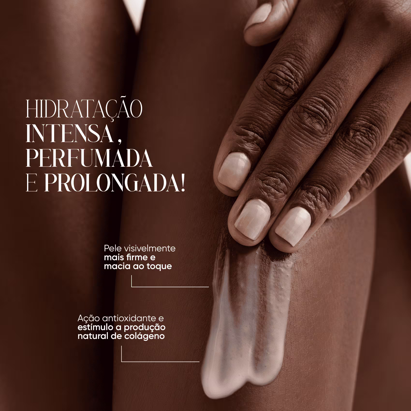 O Hidratante Corporal, formulado com Niacinamida, Manteiga de Karité, D-Pantenol e Colágeno Vegetal, proporciona +16% de hidratação e +10% de firmeza em 28 dias, deixando a pele mais luminosa, macia e confortável.