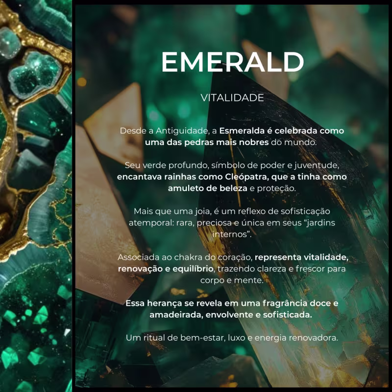 Inspirado na força da pedra Esmeralda, traz um aromatizador de ambiente com varetas e um sabonete líquido de luxo, ambos com fragrância Oriental Amadeirada doce e elegante.