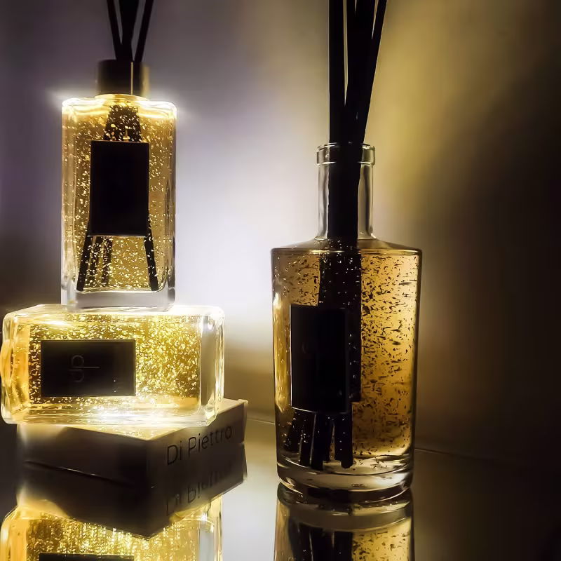 Mais que um aromatizador, o difusor Gold é uma verdadeira obra de arte olfativa. Em seu interior, folhas autênticas de ouro 22 quilates flutuam delicadamente, refletindo luz e criando uma dança hipnótica de brilho e sofisticação.