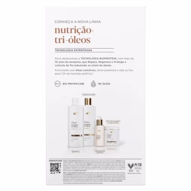 Não sei o CEPO Kit Dove Nutrição Tri-Óleos foi desenvolvido para proporcionar um tratamento completo aos cabelos ressecados, opacos e sem vida. Com a tecnologia patenteada Bio-Protein e o exclusivo Tri-Óleos Complex, o shampoo limpa suavemente enquanto nutre e repara profundamente os fios. O condicionador potencializa a hidratação, sela as cutículas e promove brilho, força e maciez desde o primeiro uso. Essa combinação poderosa restaura o brilho natural e garante até 72 horas de nutrição antifrizz, deixando os cabelos mais macios, leves e protegidos contra os danos do dia a dia. Indicado para todos os tipos de cabelo, especialmente secos, danificados ou quimicamente tratados, o kit pode ser usado diariamente e é perfeito para a etapa de nutrição do cronograma capilar. Dermatologicamente testado e cruelty-free, o Kit Dove Nutrição Tri-Óleos proporciona um cuidado seguro, eficaz e de uso contínuo. Para potencializar os resultados, use em conjunto com a máscara e o leave-in da linha Dove Nutrição Tri-Óleos.