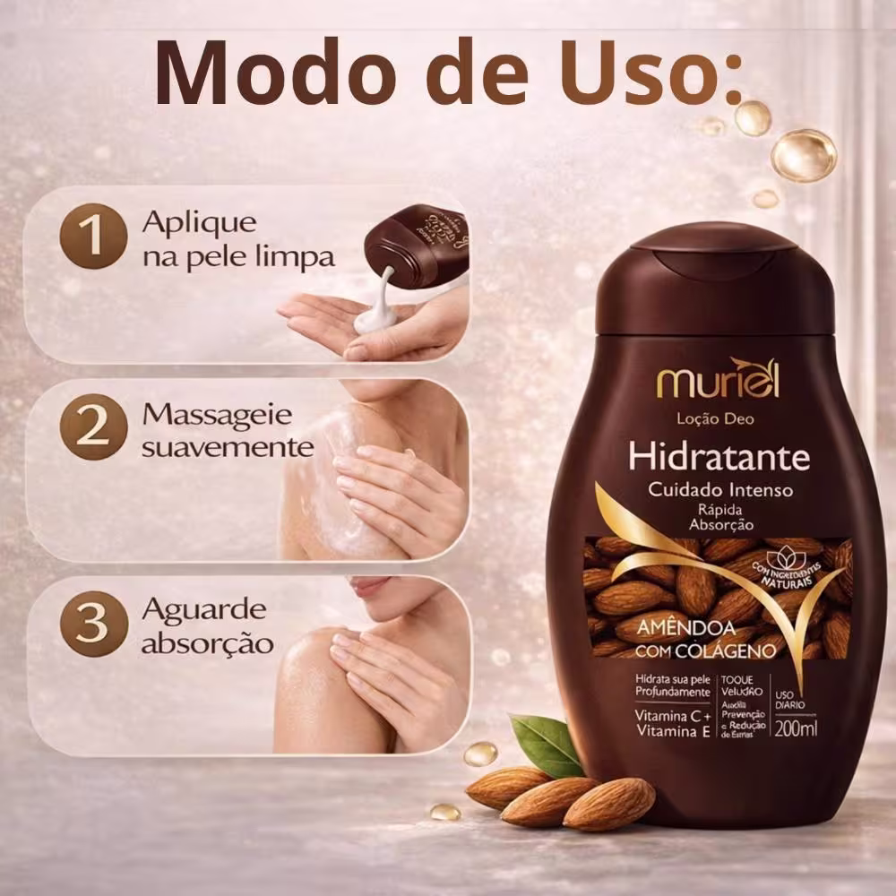 Aplique a Loção Deo Hidratante Muriel Amêndoa Com Colágeno sobre a pele limpa e seca, espalhando com movimentos suaves até completa absorção. Para melhores resultados, utilize após o banho e reaplique nas áreas mais ressecadas. Pode ser combinada com sabonetes ou óleos da linha Muriel para potencializar os efeitos de hidratação e cuidado. Massageie suavemente a pele durante a aplicação para estimular a circulação e potencializar a absorção dos nutrientes.