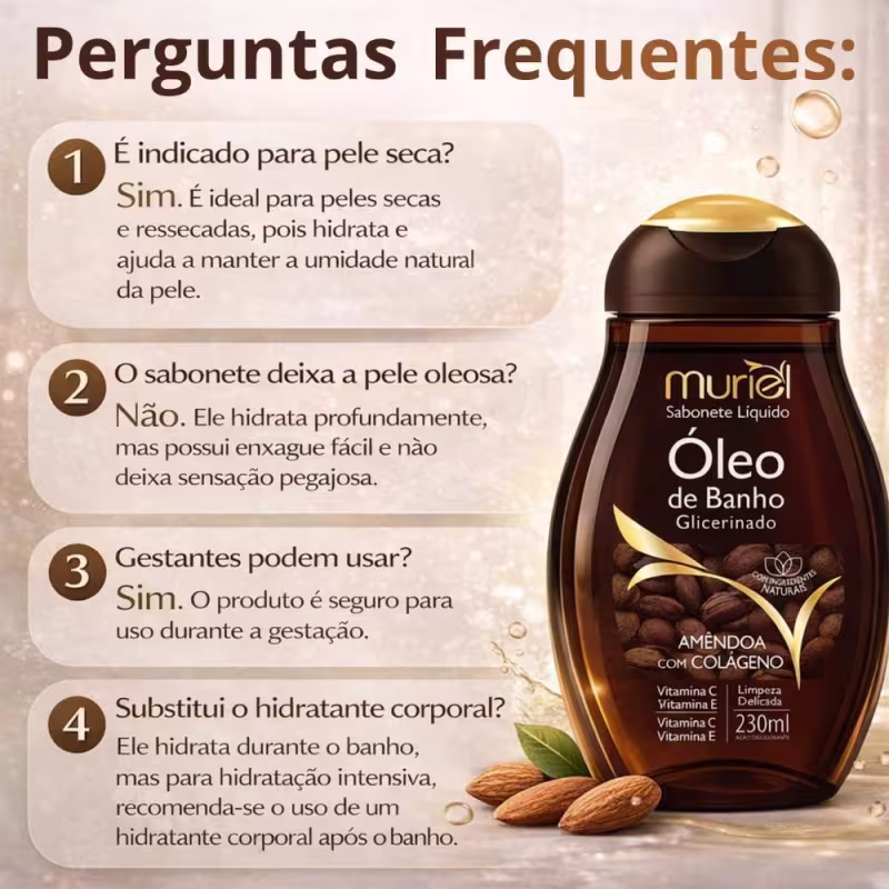 O Sabonete Líquido Muriel Óleo De Banho Glicerinado Amêndoa Com Colágeno é perfeito para o uso diário, transformando a rotina do banho em um momento de puro cuidado e conforto. É especialmente indicado para quem busca hidratação intensa e prevenção do ressecamento, sendo adequado para todos os tipos de pele, incluindo as mais sensíveis e ressecadas, e pode ser utilizado com segurança por gestantes. Ideal para relaxar após um dia cansativo, proporcionando uma sensação de bem-estar e renovação.