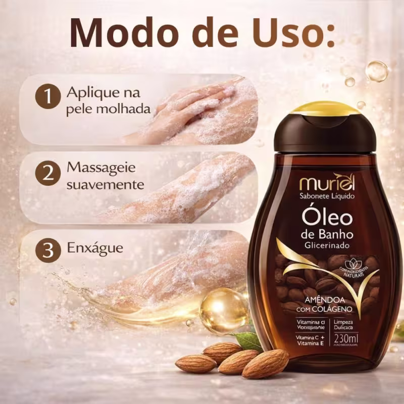 Durante o banho, aplique o Sabonete Líquido Muriel Óleo De Banho Glicerinado Amêndoa Com Colágeno sobre a pele molhada, massageando suavemente por todo o corpo com movimentos circulares. Em seguida, enxágue abundantemente com água até a remoção completa do produto.
