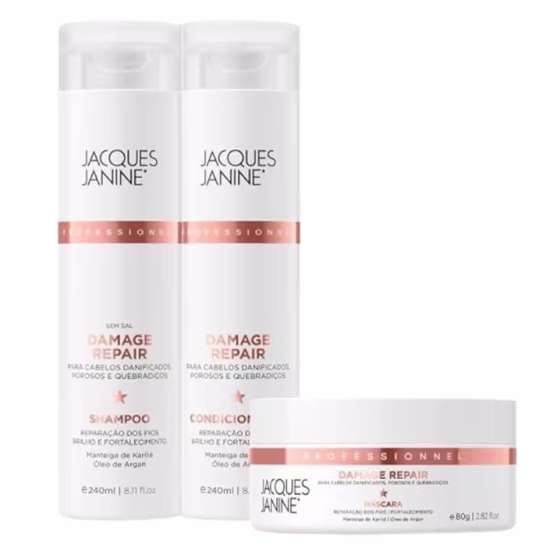 Não sei o CEPO Jacques Janine Kit Damage Repair é um conjunto de produtos de uso profissional que promovem a reparação e reconstrução capilar. O kit é composto por um shampoo de 240ml, um condicionador de 240ml e uma máscara de tratamento de 80g.