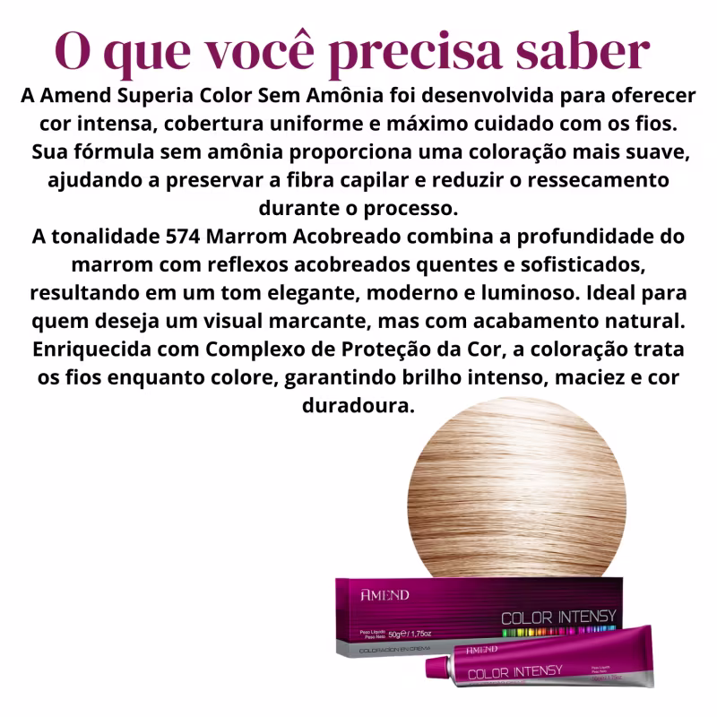 O Amend Superia Color Sem Amônia 574 Marrom Acobreado é uma coloração permanente desenvolvida para quem deseja cor intensa, quente e sofisticada, sem abrir mão do cuidado com os fios.