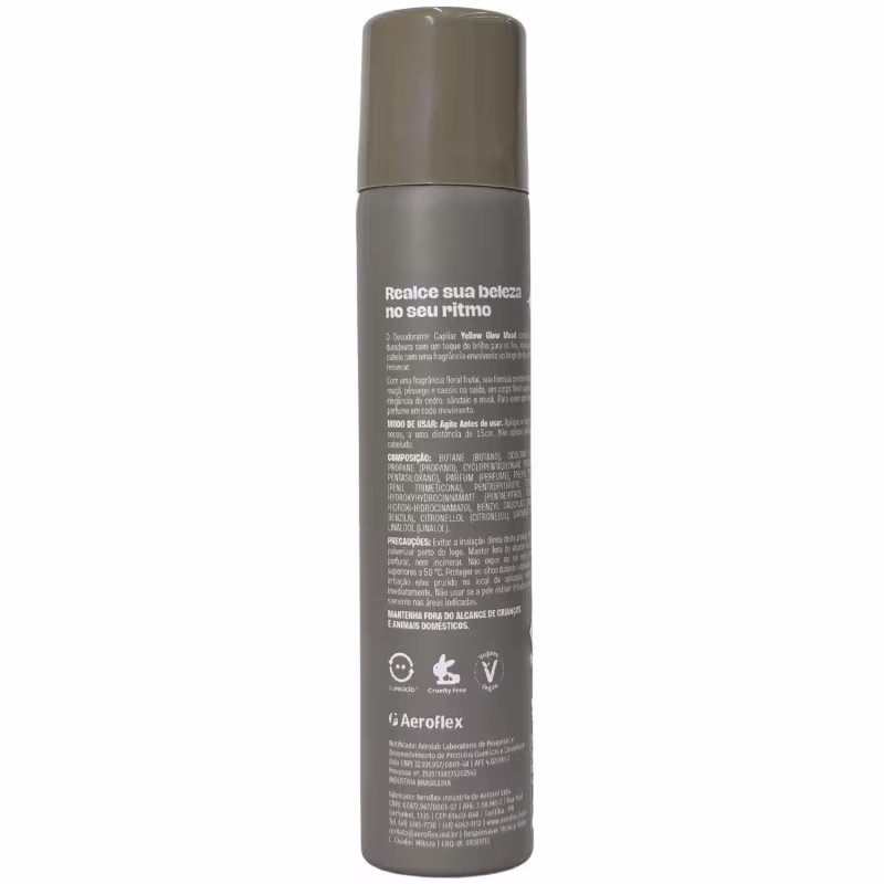 Finalidade: O desodorante capilar Yellow Glow Mood combina perfumação duradoura com um toque de brilho para os fios, ideal para deixar seu cabelo com uma fragrância envolvente ao longo do dia, sem pesar, sem ressecar. Com uma fragrância floral frutal, sua fórmula combina notas frescas de maçã, pêssego e cassis na saída, um corpo floral suave e, ao fundo, a elegância do cedro, sândalo e musk. Para quem quer leveza, brilho e perfume em cada movimento.