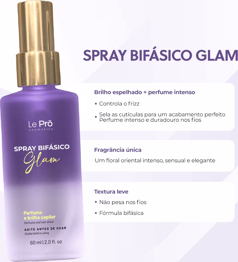 Não sei o CEPO finalizador que une perfume marcante e brilho intenso em um só produto. O Spray Bifásico Glam - Perfume e Brilho foi criado para entregar um acabamento elegante, com efeito iluminado e perfume envolvente, seja ao finalizar o cabelo no dia a dia ou dar aquele toque especial antes de sair.