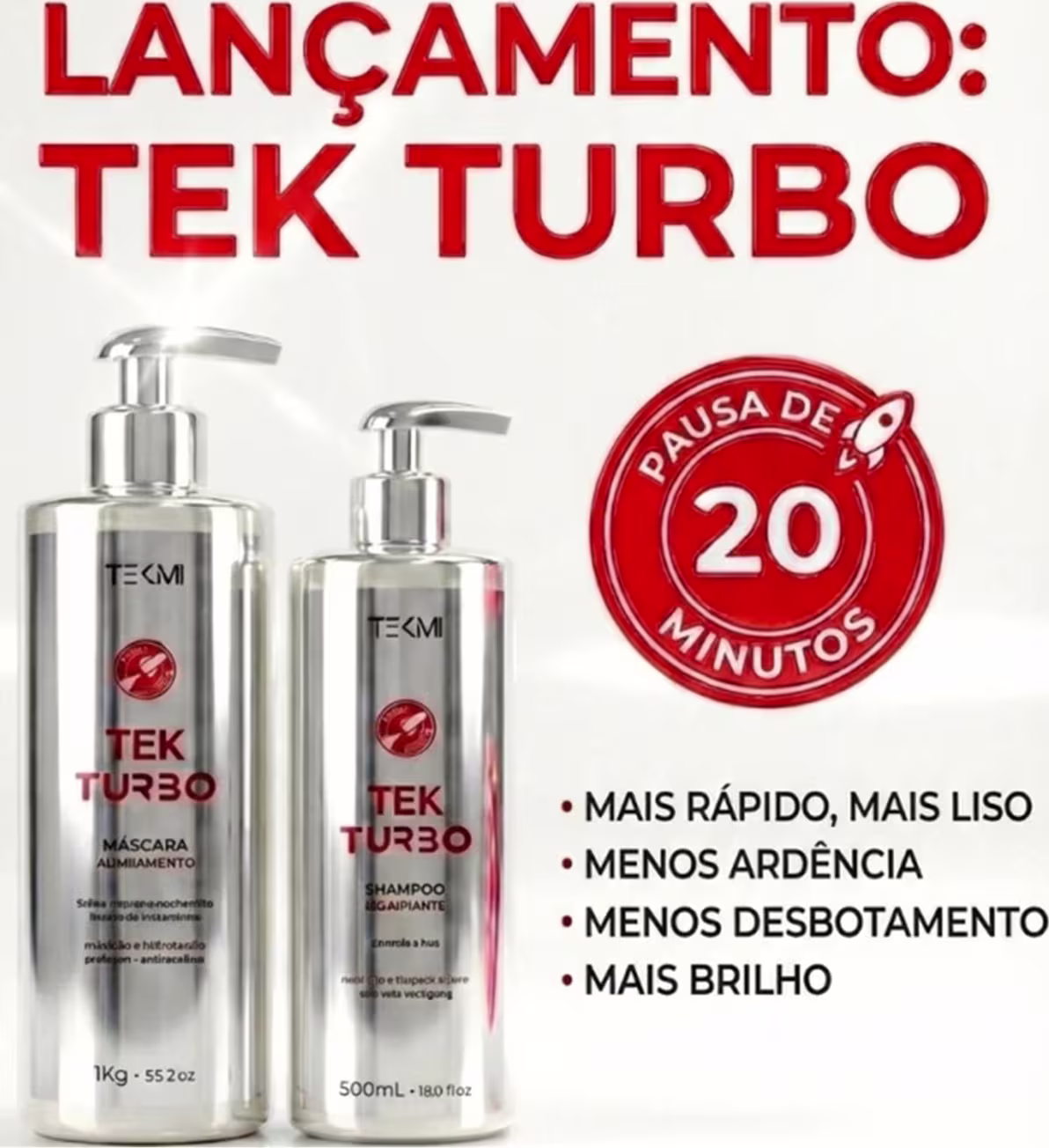 🧴 Descrição dos ProdutosShampoo Preparatório Tek Turbo – 500mlO Shampoo Preparatório Tek Turbo Tekmi foi desenvolvido com Aloe Vera e Colágeno, promovendo limpeza equilibrada, auxiliando no controle do frizz e preparando os fios para receber o processo de alinhamento, sem ressecar excessivamente.