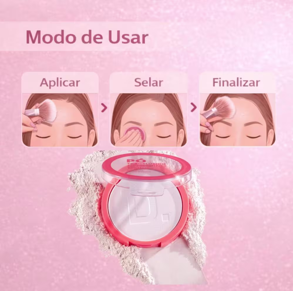 Com o auxílio de uma esponja ou pincel, aplique o pó no rosto, focando especialmente na zona T ou nas áreas onde deseja reduzir o brilho e fixar a maquiagem. Para manter o efeito desejado, reaplique ao longo do dia, se necessário. Dica: Para um acabamento ainda mais natural, utilize um pincel grande e macio para espalhar o pó uniformemente, garantindo uma cobertura leve e homogênea. Experimente aplicar o pó com leves batidinhas para um acabamento mais profissional e duradouro.